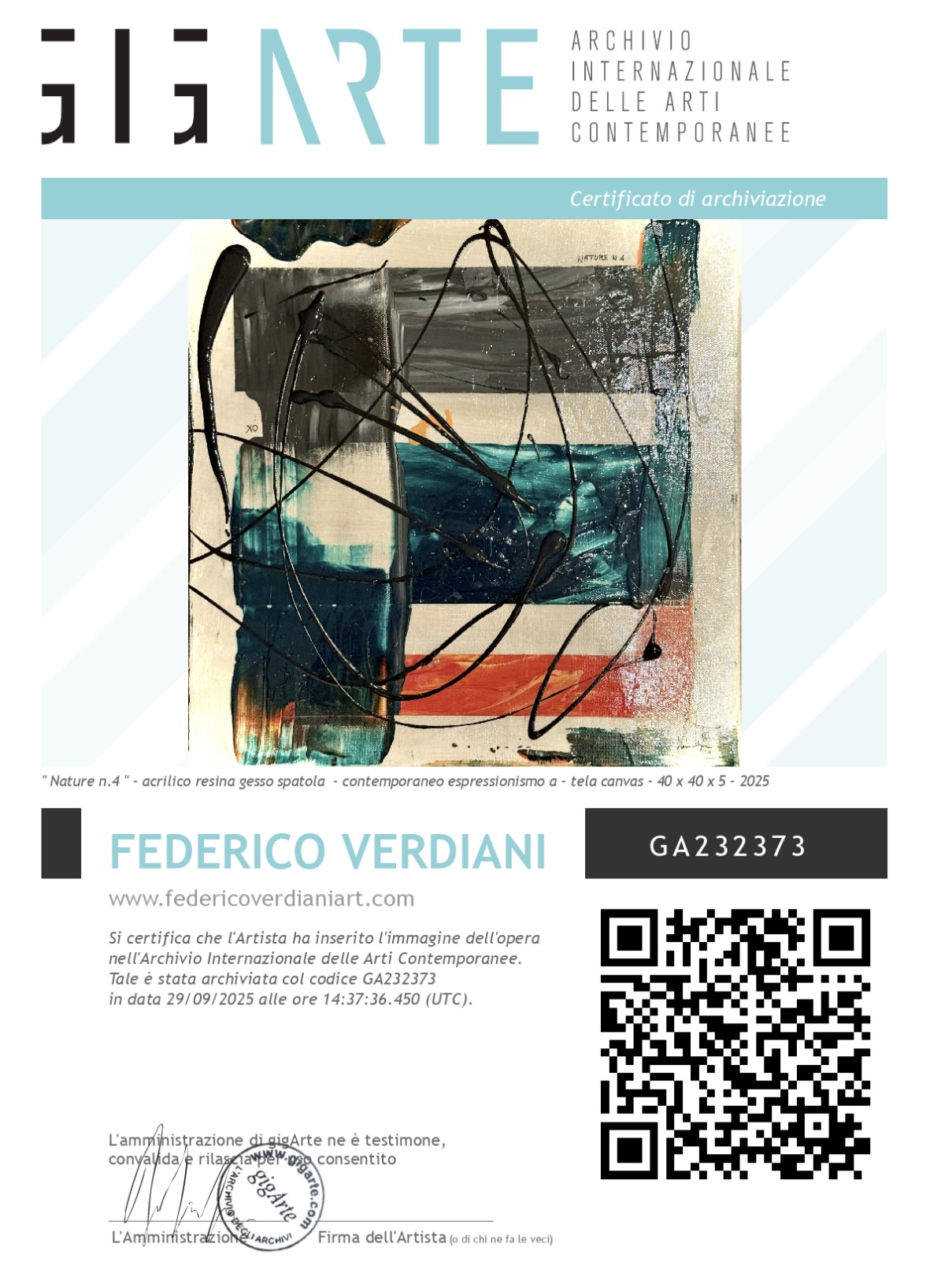 Si certifica che l'artista Federico Verdiani lunedì 29 settembre 2025 ha archiviato la foto dell'opera GA232373 dal titolo "Nature n.4"