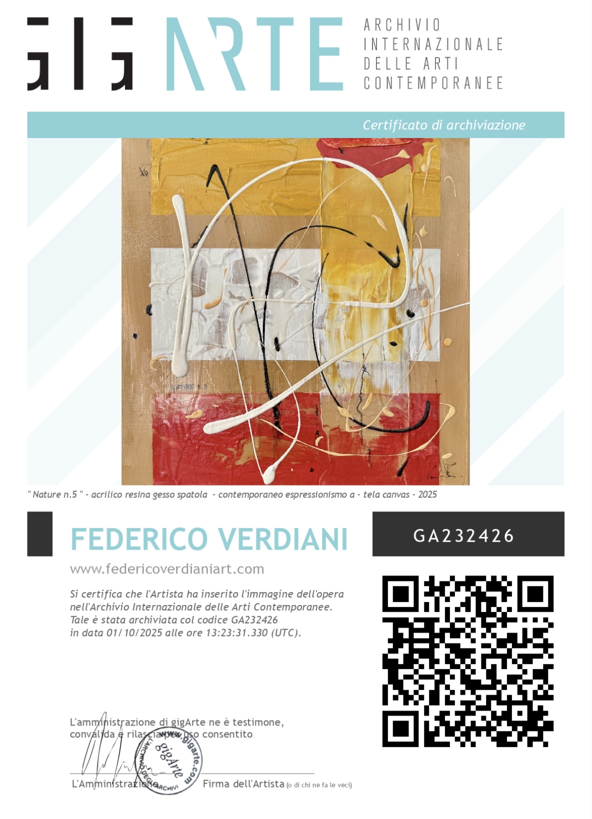 Si certifica che l'artista Federico Verdiani mercoledì 1 ottobre 2025 ha archiviato la foto dell'opera GA232426 dal titolo "Nature n.5"