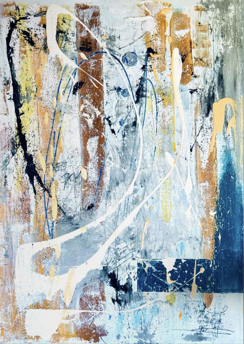 Acrilico resina gesso spatola e pennello, tela canvas, 2021No Doubt, la composizione si apre con una danza di colori contrastanti — blu profondi, arancioni caldi, e bianchi netti — che si intrecciano su una base testurizzata e stratificata. Pennellate gestuali e schizzi di vernice sembrano guidati dall’impulso emotivo, evocando movimento, caos e al contempo equilibrio. Linee curve e flussi di colore bianco attraversano la tela come percorsi di luce, rompendo la struttura e sfidando ogni simmetria.