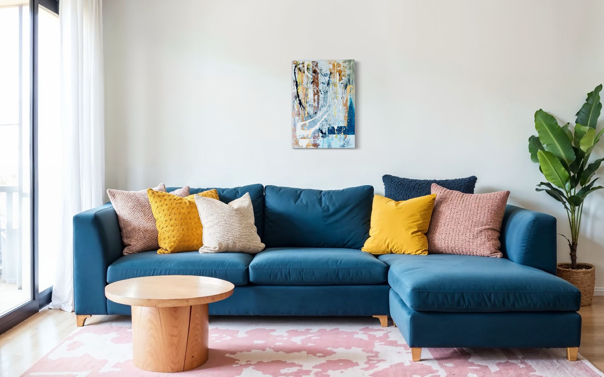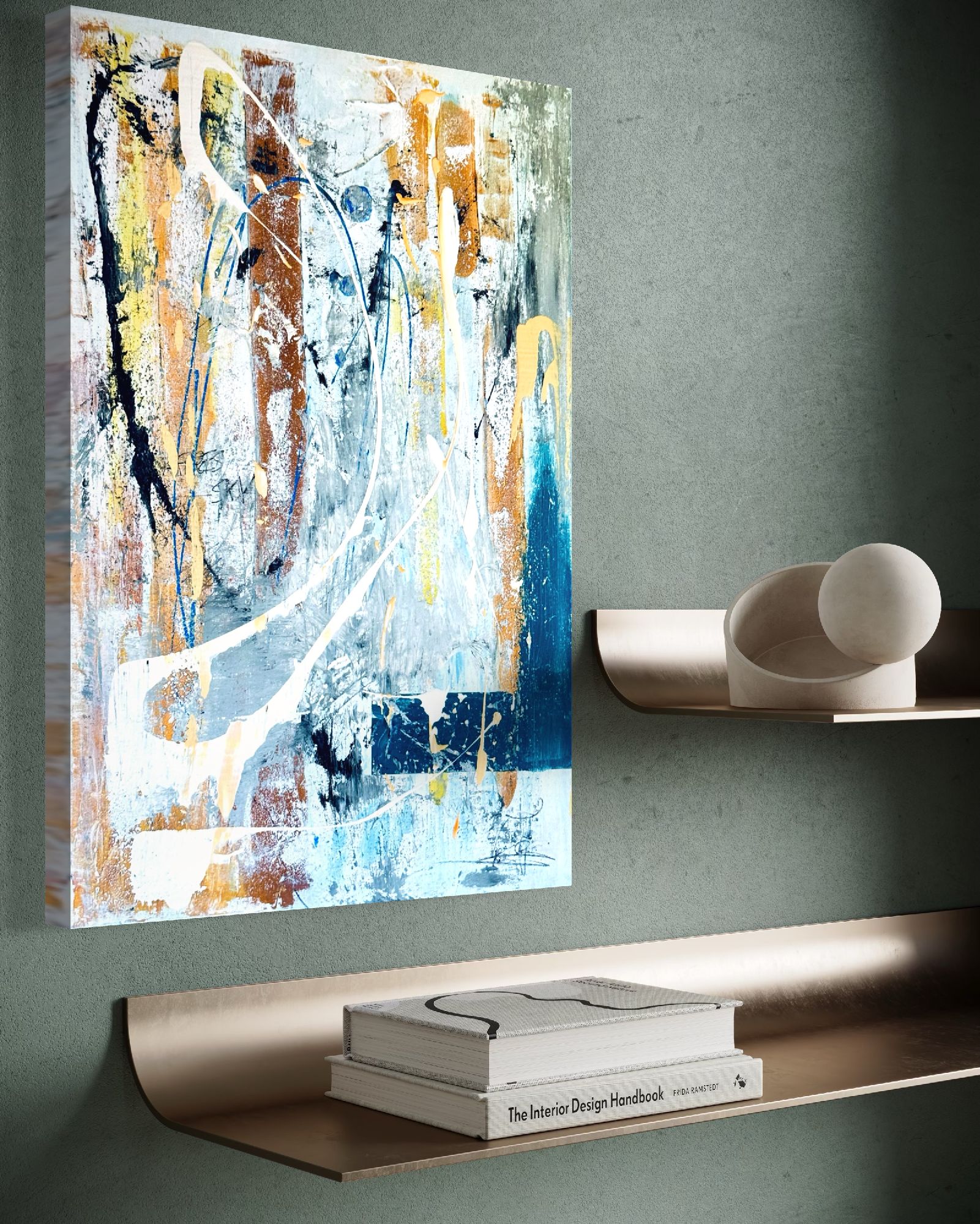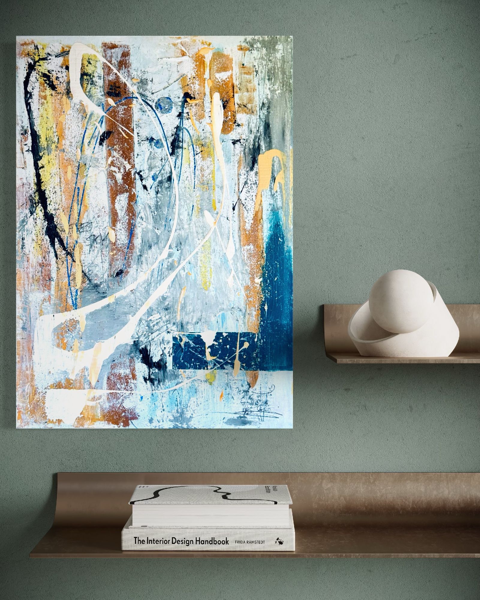 The composition opens with a dance of contrasting colors — deep blues, warm oranges, and crisp whites — interwoven on a textured, layered base. Gestural brushstrokes and splashes of paint appear guided by emotional impulse, evoking movement, chaos, and at the same time, balance. Curved lines and streams of white color cut across the canvas like paths of light, breaking the structure and defying all symmetry.