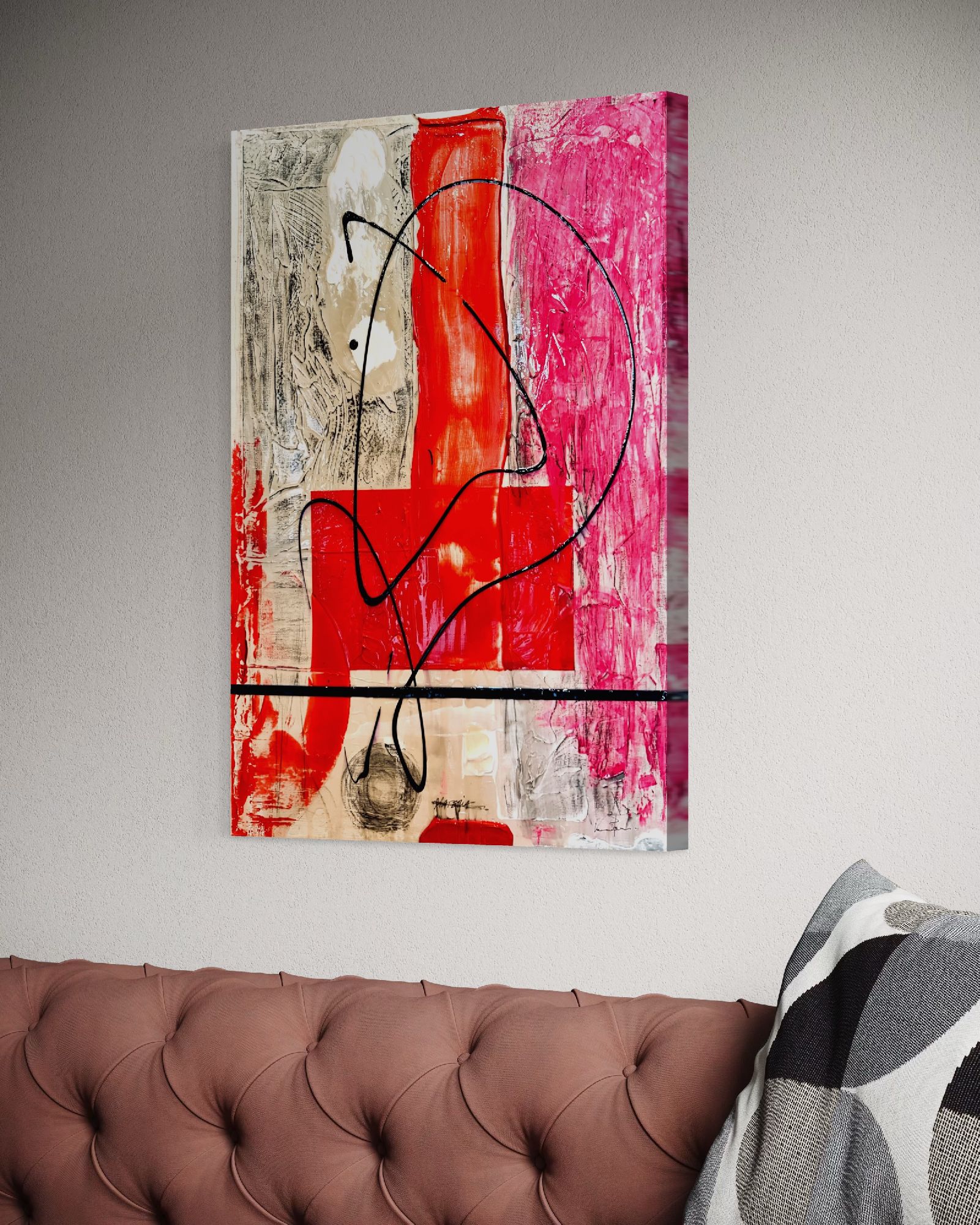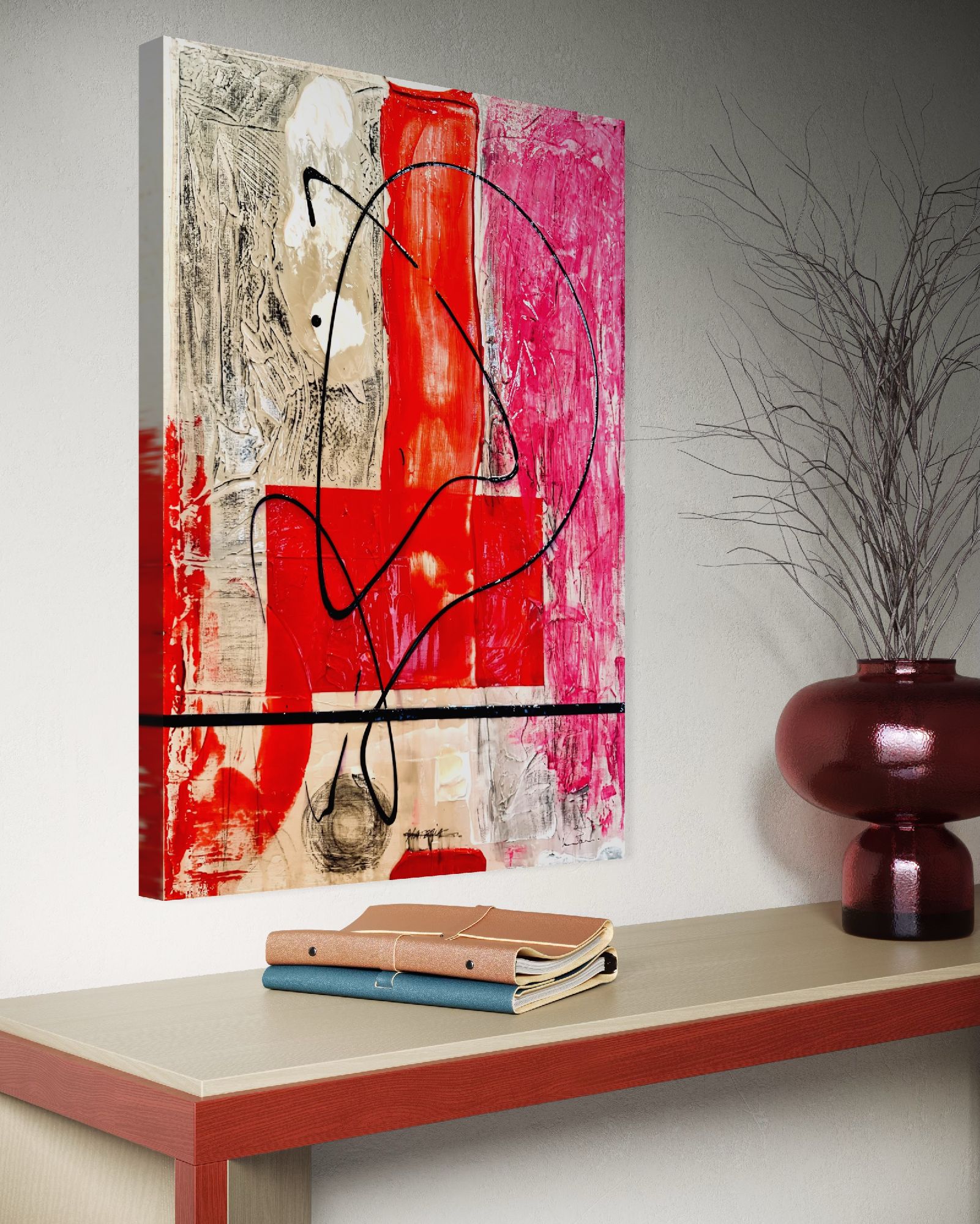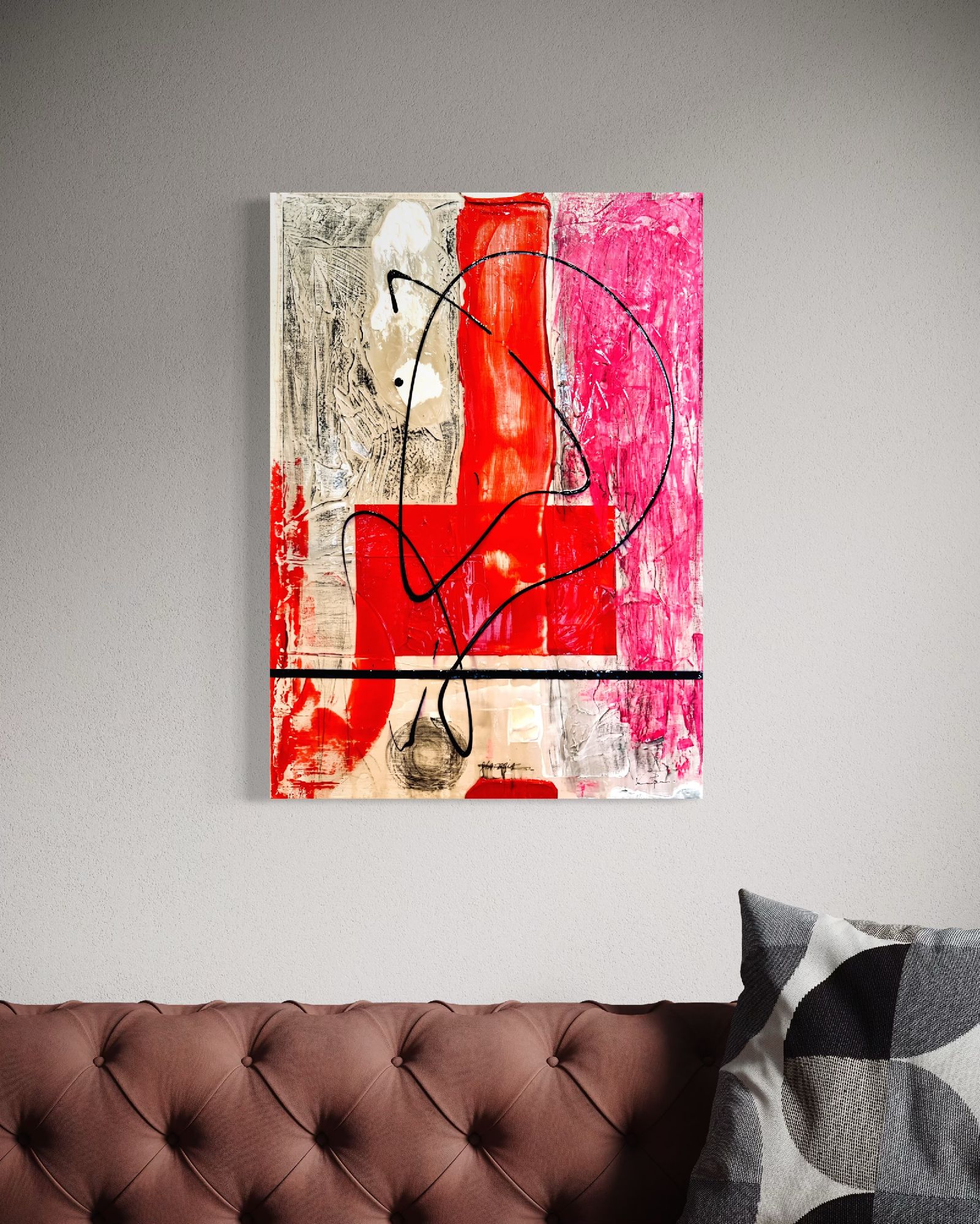 Una composizione astratta che esplora l'essenza del movimento e della trasformazione. L'opera presenta un vivace intreccio di toni rossi, neri e grigi, dove ogni colore pulsa di energia ed emozione. Curve e angoli si scontrano in un fluido dinamismo, mentre lo sfondo audace ancorano l'opera, invitando lo spettatore in un mondo dove forma e pensiero sono in continua evoluzione.