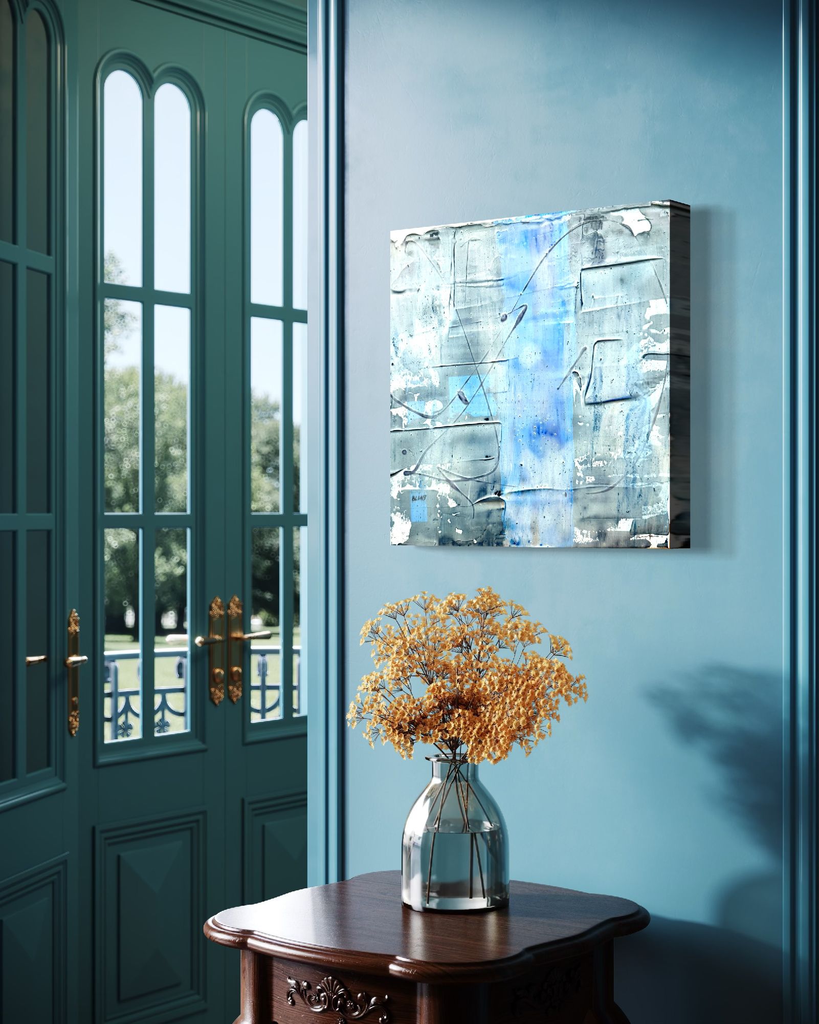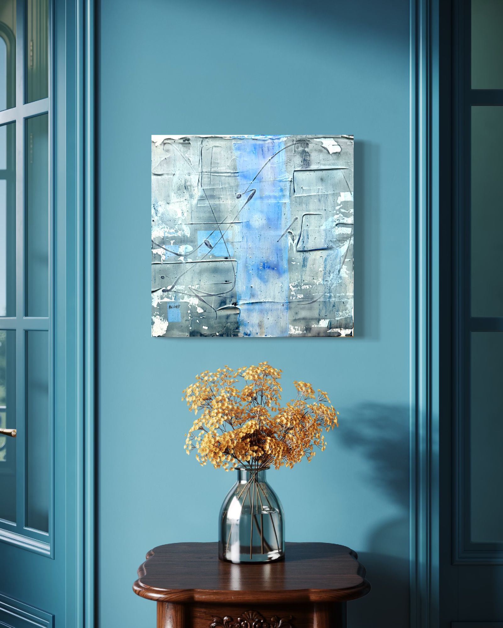 Acrilico resina gesso spatola e pennello, tela canvas, 2025Una composizione astratta rilassante nei toni del blu tenue e del grigio freddo, caratterizzata da linee morbide e fluide e da texture stratificate. L’opera trasmette una sensazione di calma e atmosfera, con sfumature delicate, transizioni morbide e uno stile moderno e minimalista. Texture opaca e finitura lucida, composizione equilibrata, atmosfera tranquilla e cura di ogni dettaglio