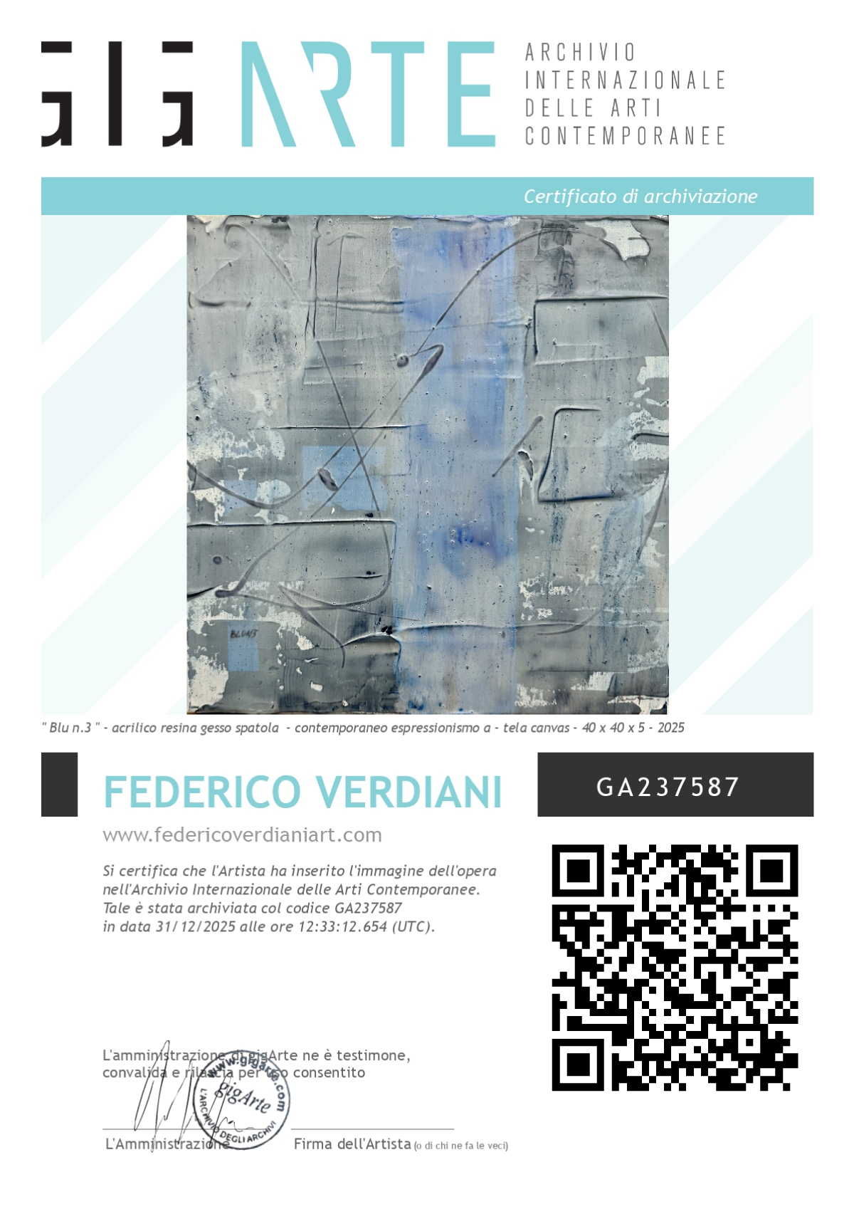 Si certifica che l'artista Federico Verdiani mercoledì 31 dicembre 2025 ha archiviato la foto dell'opera GA237587 dal titolo "Blu n.3"