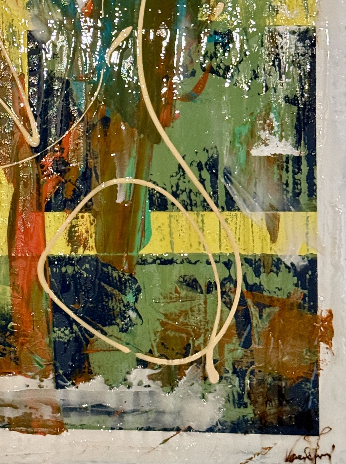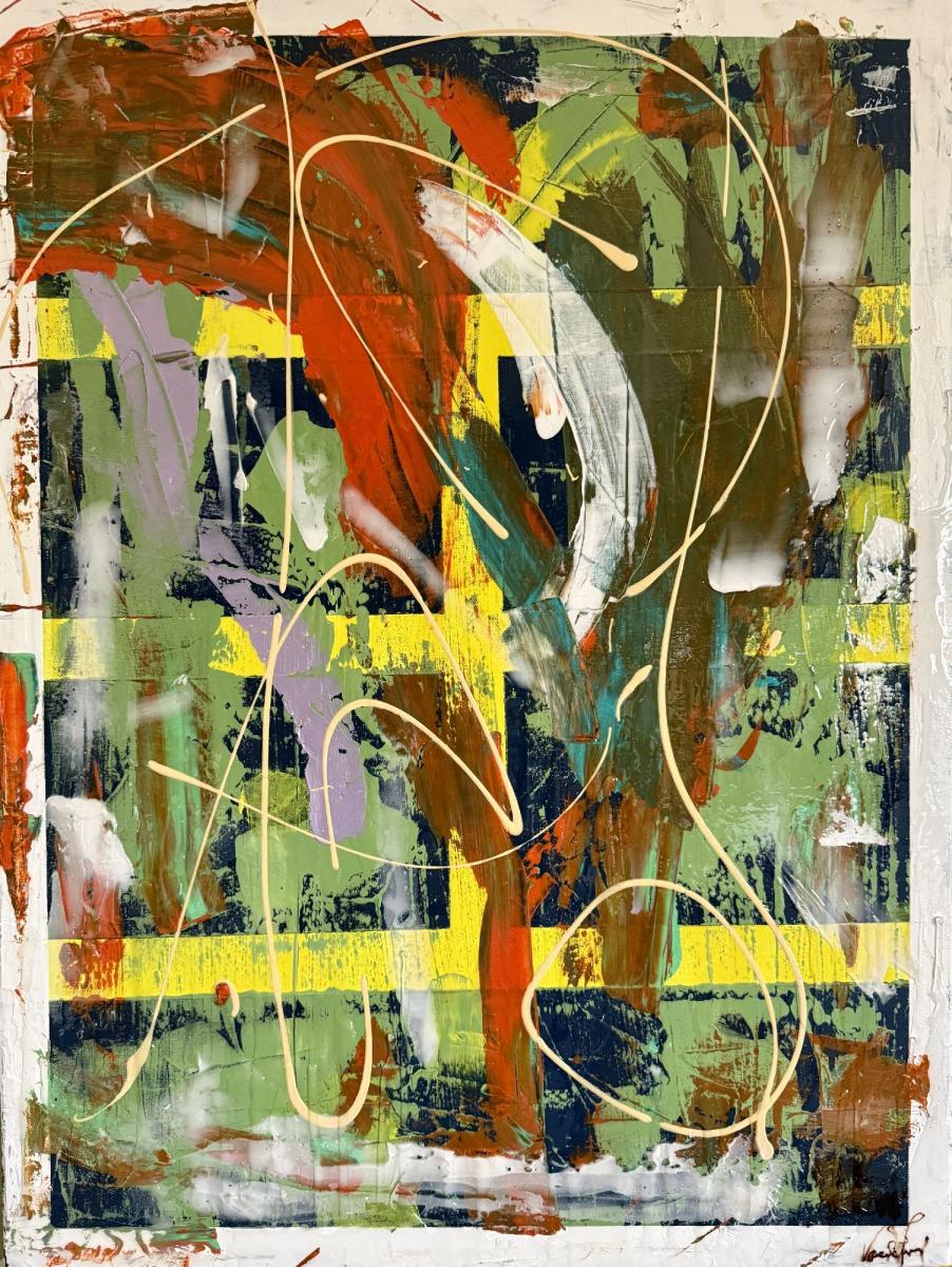 A prima vista, la composizione è un’esplosione: audaci pennellate di rosso, verde, giallo e nero si scontrano e si sovrappongono in un caos ritmico. La superficie vibra di energia, come se ogni gesto fosse catturato nell’istante dell’impatto. Le linee si incurvano, si spezzano e si intrecciano sulla tela, creando una sensazione di movimento continuo—una vera e propria “danza” visiva che coinvolge lo spettatore.