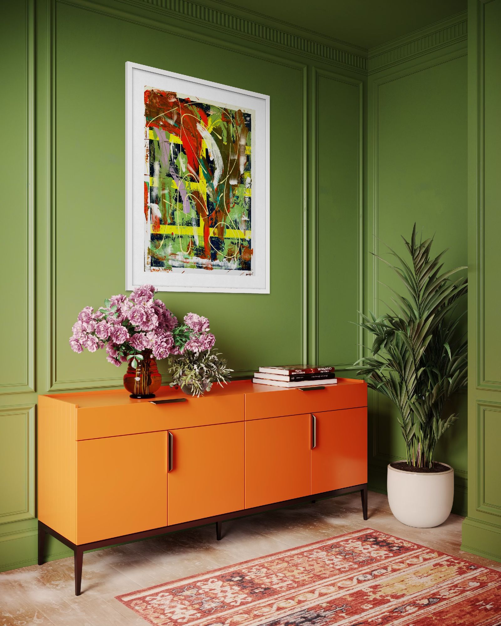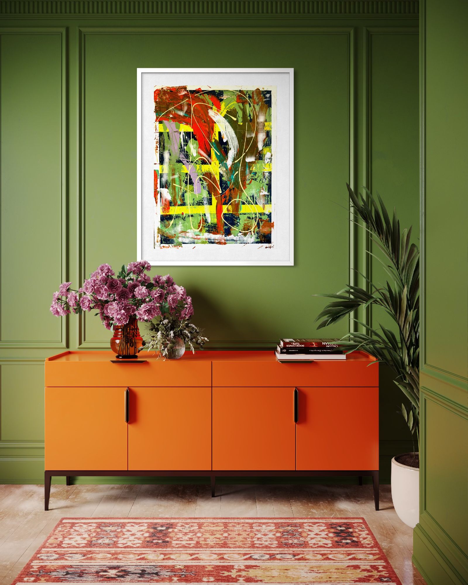 Inserita in una cornice bianca essenziale e collocata in un ambiente dal forte carattere cromatico, l’opera diventa un punto focale capace di energizzare lo spazio. Invita a uno sguardo prolungato, rivelando dettagli sempre nuovi tra stratificazioni e segni.