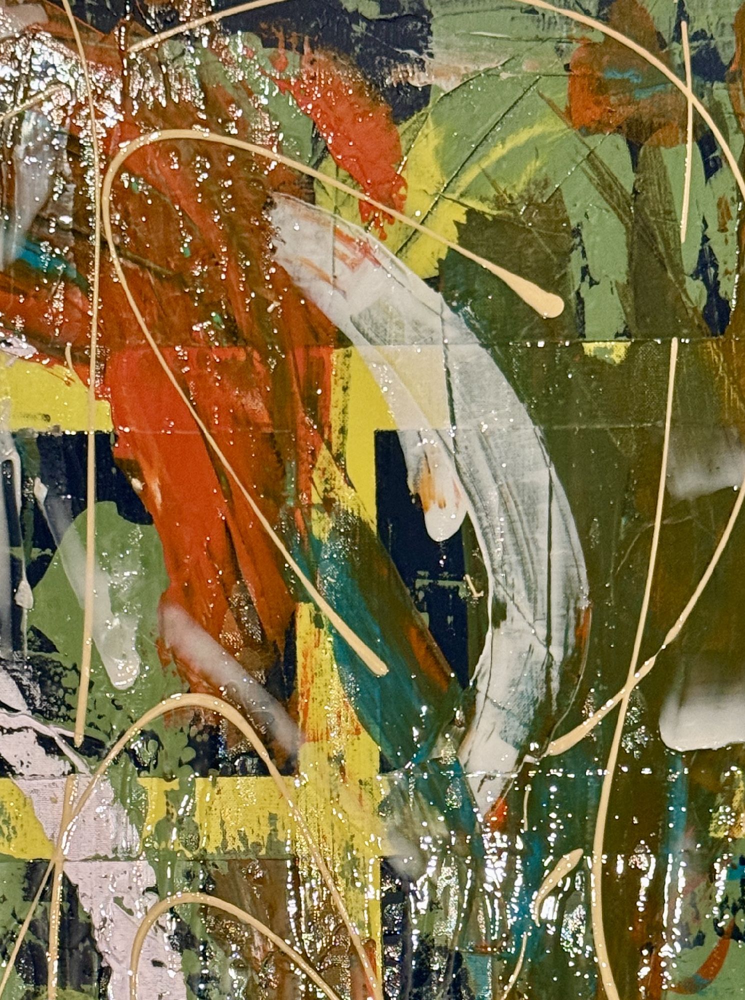 At first glance, the composition is an explosion: bold strokes of red, green, yellow, and black collide and overlap in a rhythmic chaos. The surface vibrates with energy, as if each gesture were captured mid-impact. Lines arc, slash, and weave across the canvas, creating a sense of motion that never fully settles—an ongoing visual “dance” that pulls the viewer into its momentum.