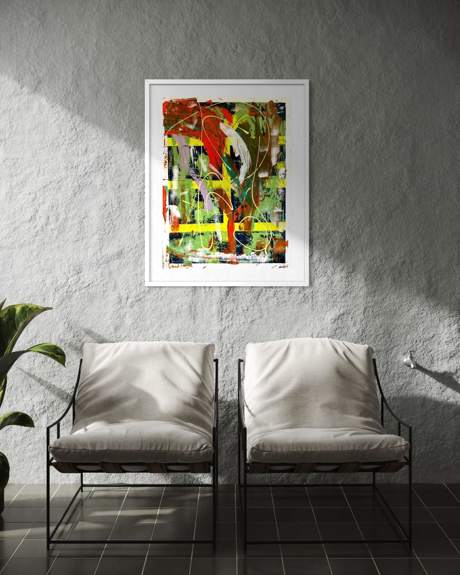Mounted within a clean white frame and placed against a bold interior setting, the artwork becomes a focal point that energizes its environment. It invites prolonged viewing, rewarding attention with new discoveries in its layered gestures and hidden form.