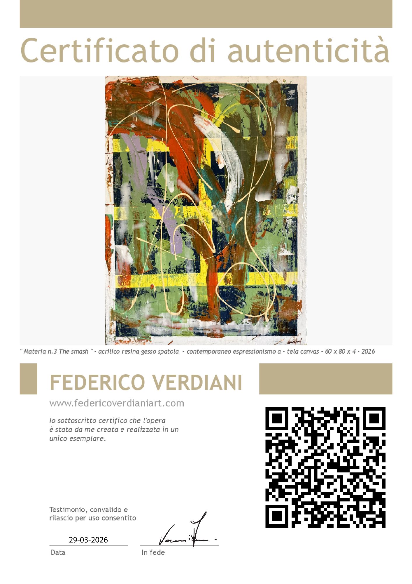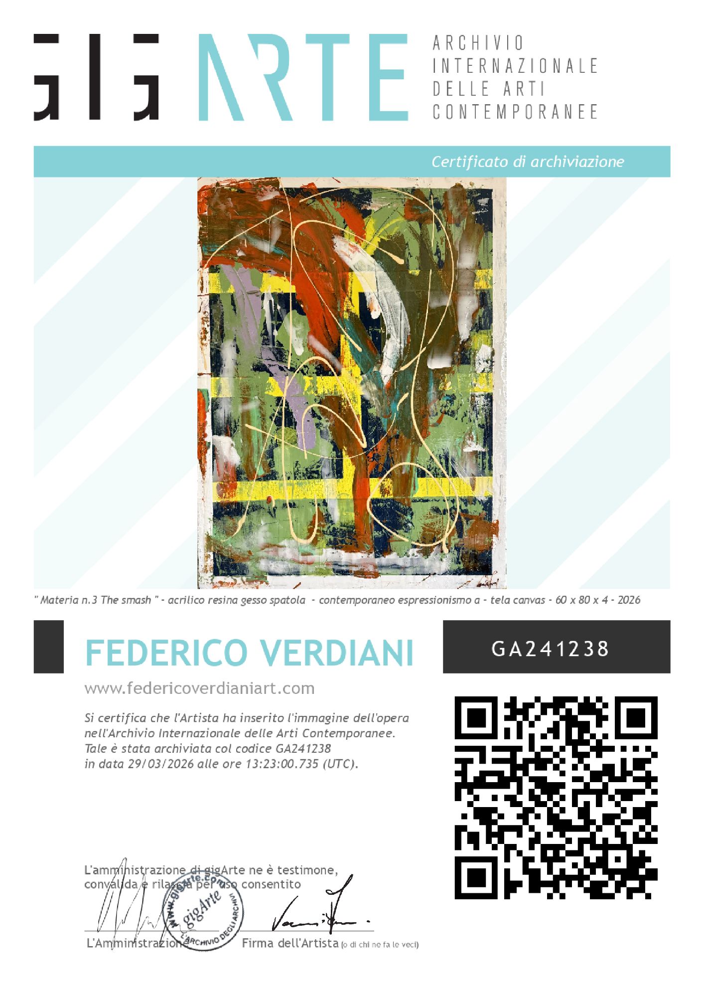 Si certifica che l'artista Federico Verdiani domenica 29 marzo 2026 ha archiviato la foto dell'opera GA241238 dal titolo "Materia n.3 The smash"